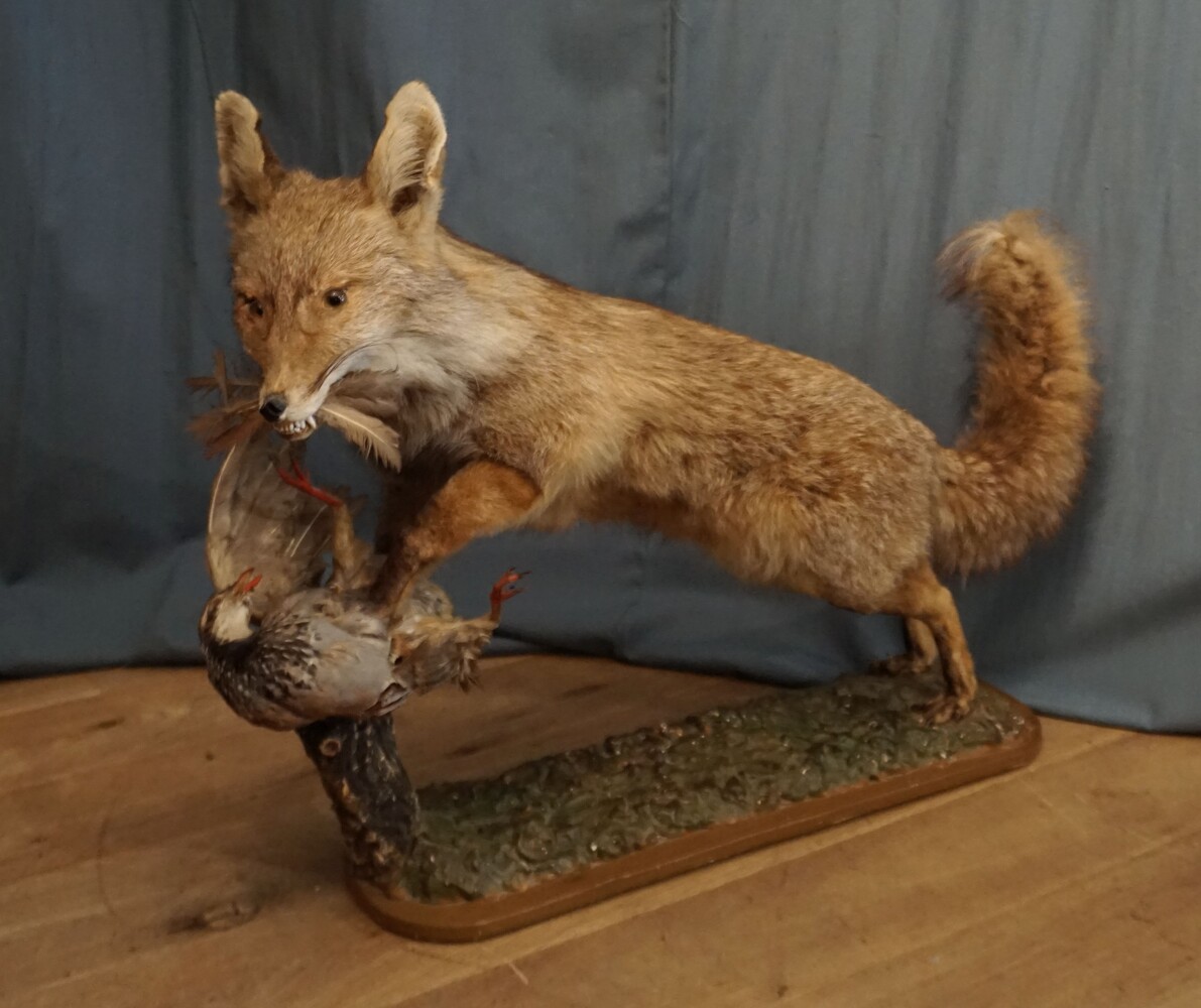 Lovely stuffed red Fox catching an unfortunate red legged Partridge for supper.