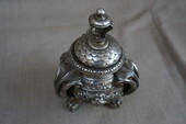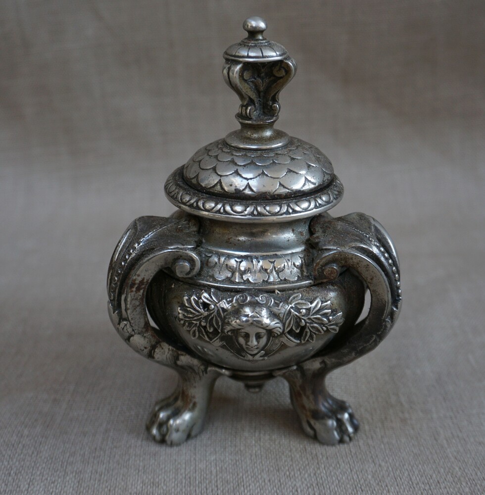 Very decorative ink pot, age unknown, silver plated heavy and detailed cast metal, missing the liner for decoration only.