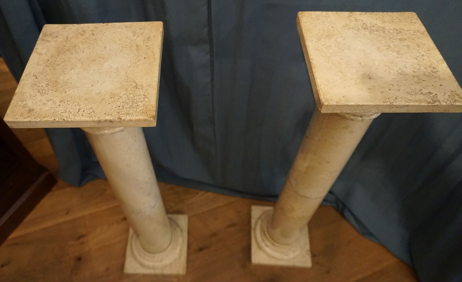Lovely pair of marble pedestals, nicely aged with some visible repairs.