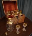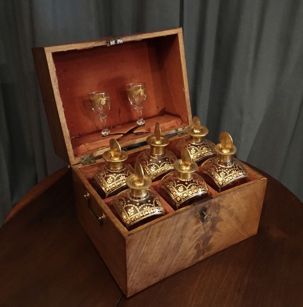 Lovely Tantalas with six matching decanters with gilded decoration and a pair of matching liquer glasses in a curl mahogany case, 19th century probably French in origin.