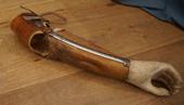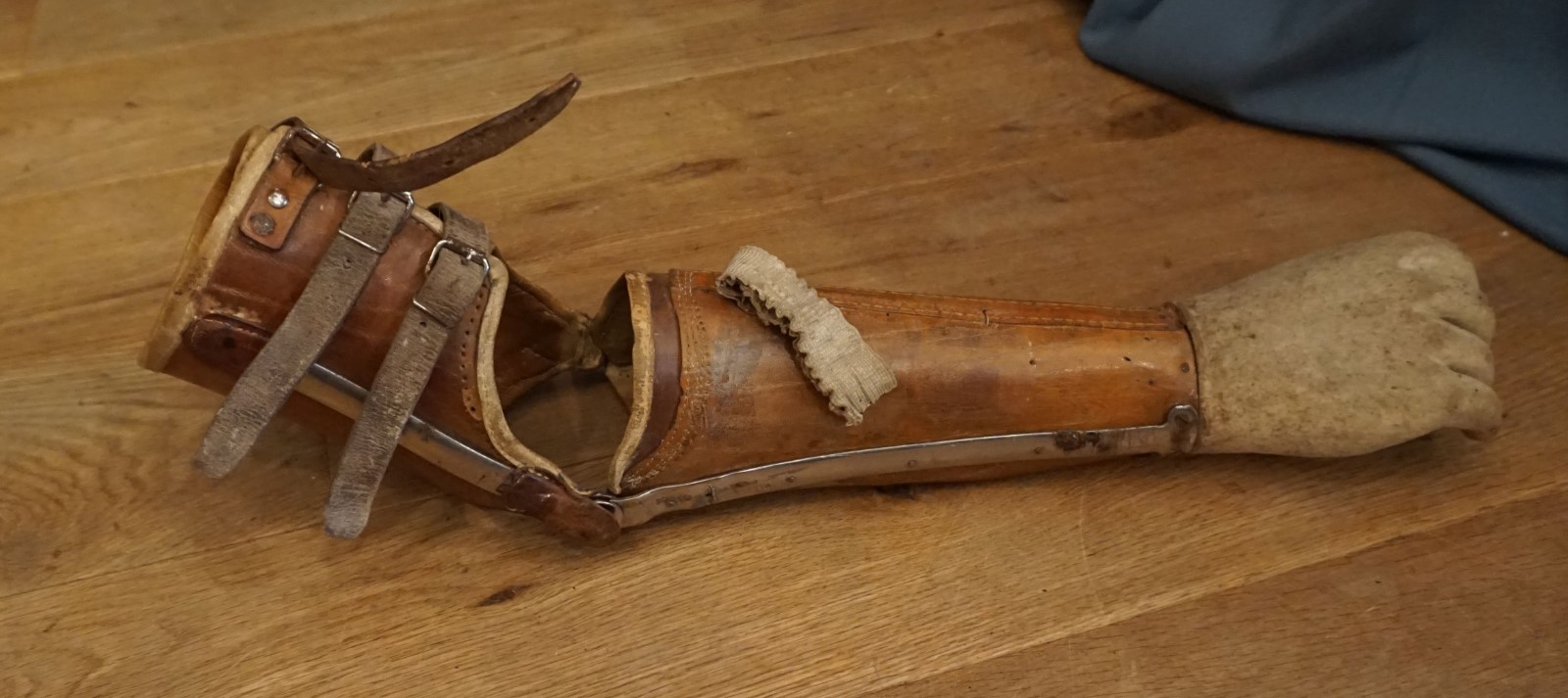 Early 20th century prosthetic arm and hand, in leather with metal bracing and a felt hand.size: 60cm.