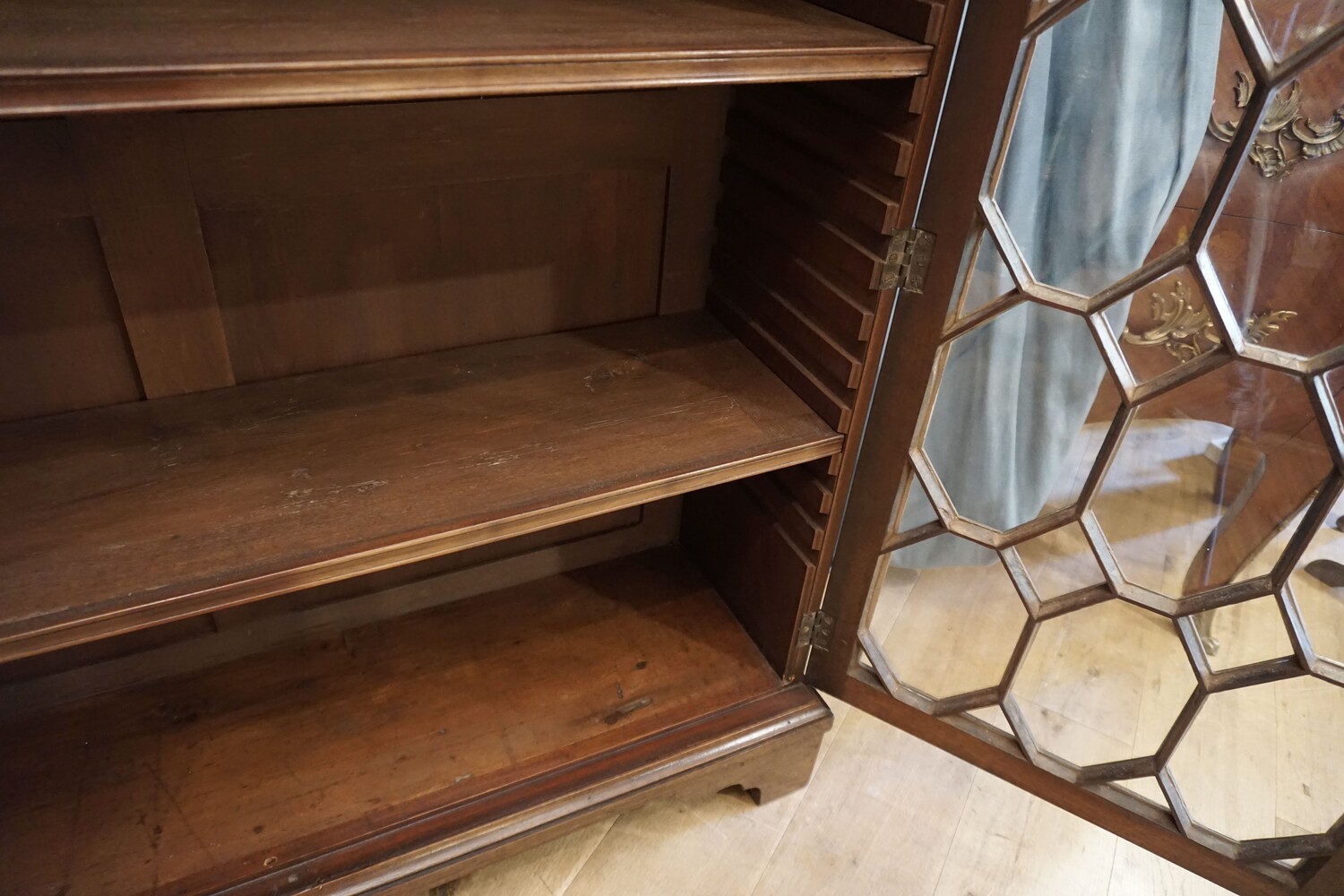 Lovely small mahogany bookcase/display cabinet, solid mahogany late 18th century, very remarkable barring pattern. inside two adjustable shelves, lovely old waxed patina.