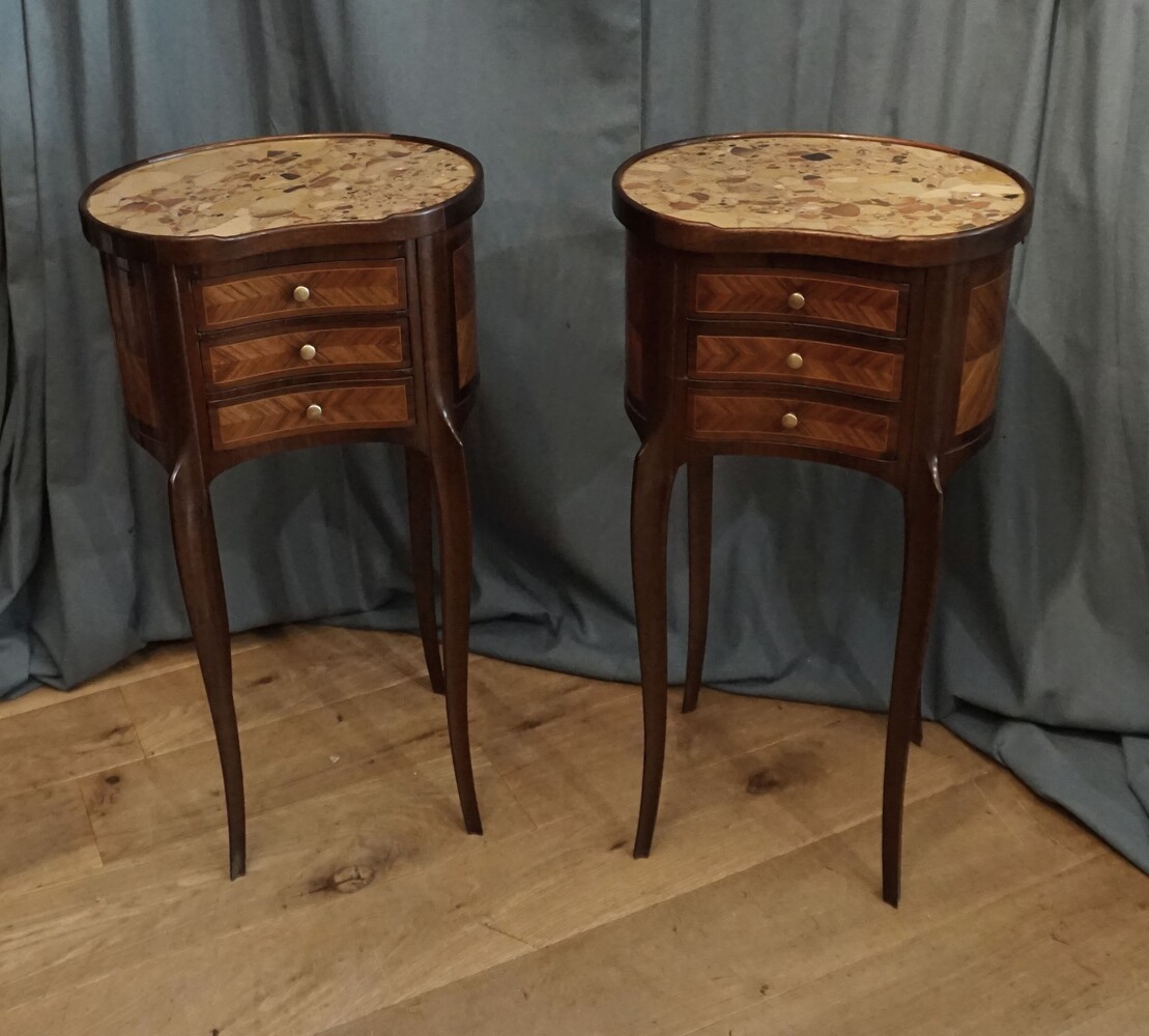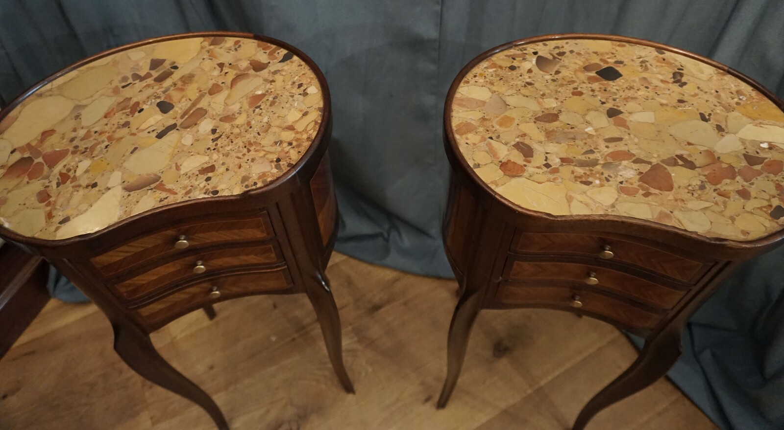 Lovely pair of vintage French kidney form bedside tables, mahogany and kingwood inlaid, three drawers two candle slides and lovely marble tops, in very good condition.