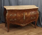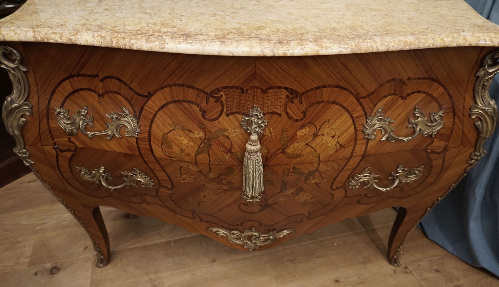 Lovely vintage large size French comode with cast brass decoration on kingwood marquetry veneered carcase, good condition, with a marble top.