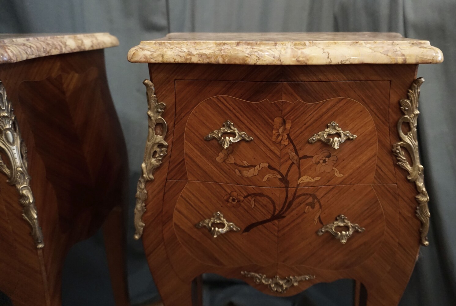 Lovely vintage pair of kingwood bedside tables with marquetry flowers inlaid and cast brass fittings.