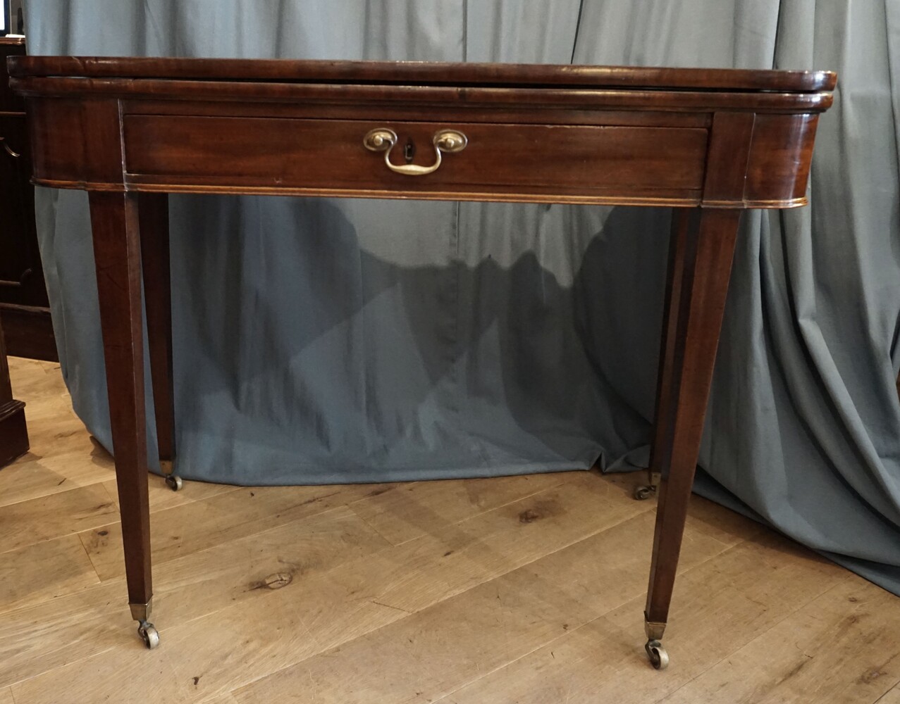Lovely mahogany late 18th century fold-over tea table, with drawer, double action rear legs, nice simple square tapered legs and brass cup castors.