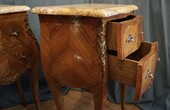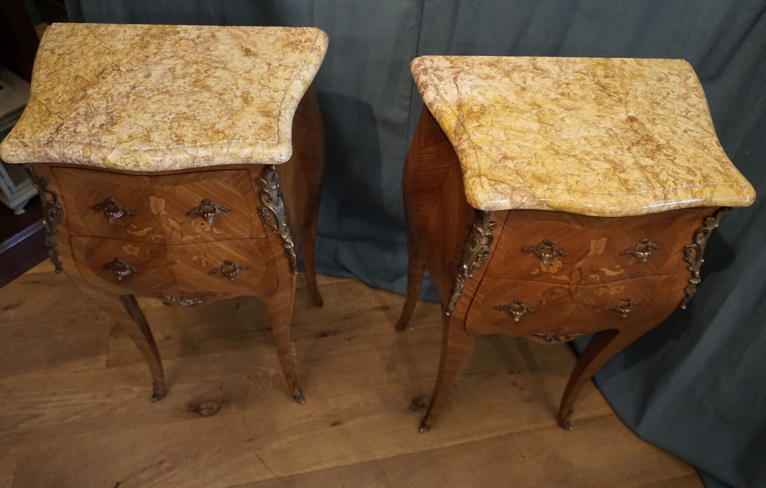Lovely pair of vintage French bedside tables in Kingwood veneer with marquetry decoration and lovely marble tops.