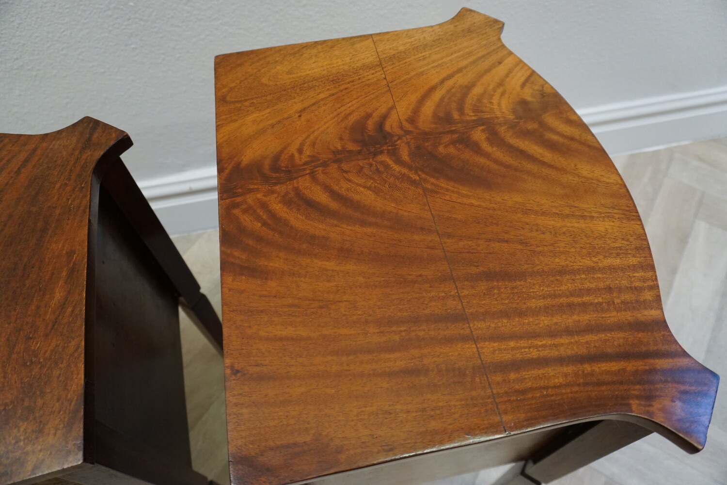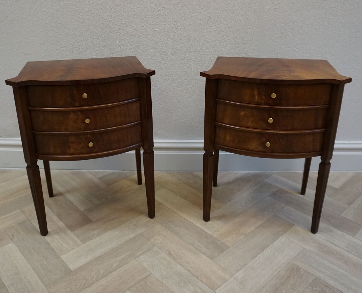 Here a a nice pair of  Vintage  bow fronted mahogany bedside tables, early 20th century, good colour three usable sized drawers, all solid wood construction.