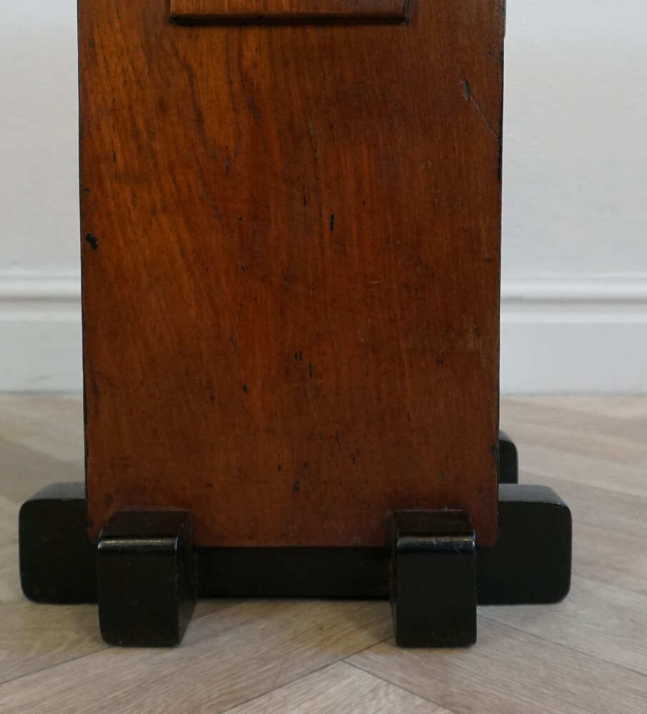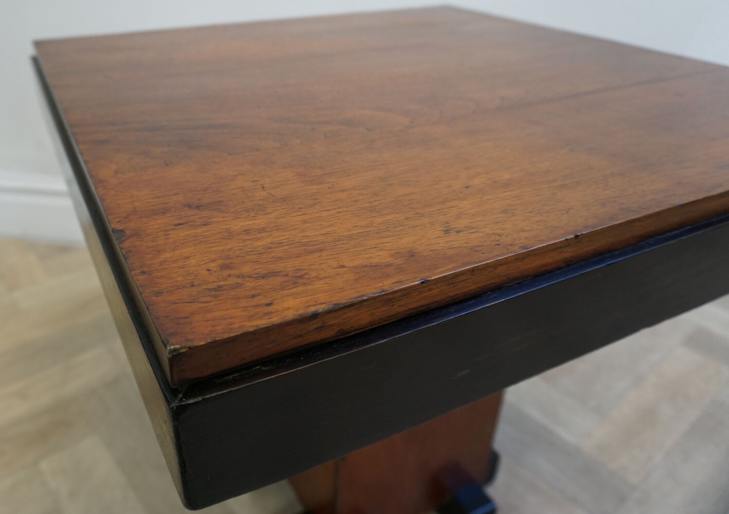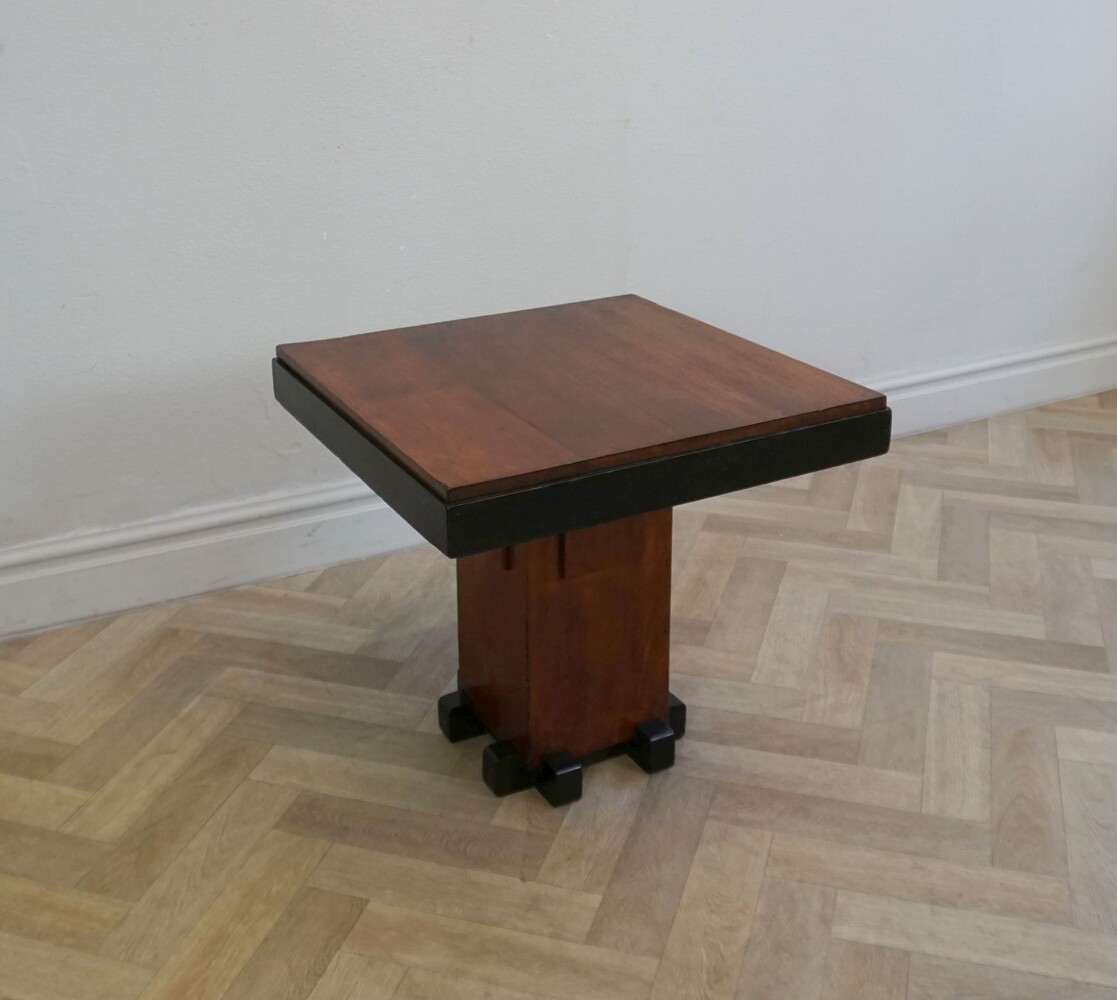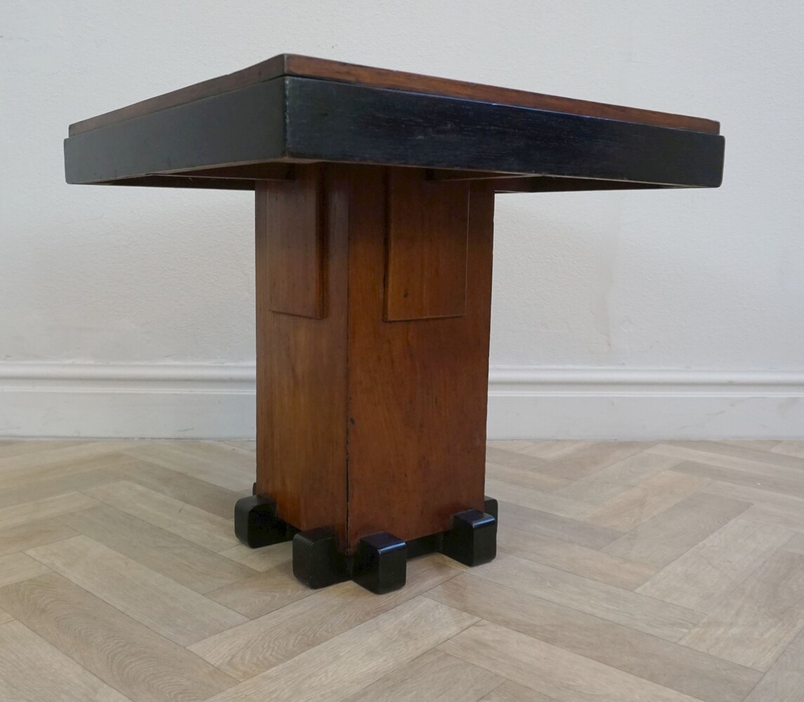 This is an original School of the Heeg Modernist table, dates back to the late 1920s. Designer unknown, but is very typical of some of the famous Heegs deco designs of around that period. Solid walnut with ebonized decoration on the feet and outside edge. Condition strong and sturdy, recently restored with attention to polish work, has a waxed finish over a shellac sealer, and maintains a lovely mellow lightly antiqued patina, with minimal marks and blemishes consistent with age.