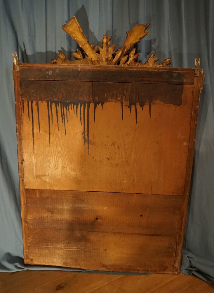 Lovely 19th century French mirror, popular model with the narrow side strips, all original glass, lovely decorated cornice with birds and acanthus leaves, nice patination.