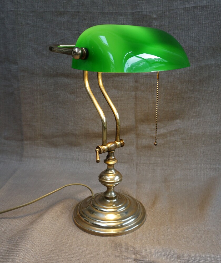 Solid heavy brass desk lamp, fully adjustable with the well-known green glass shade, this is a vintage item not an antique, in very good condition with a pull chain switch.