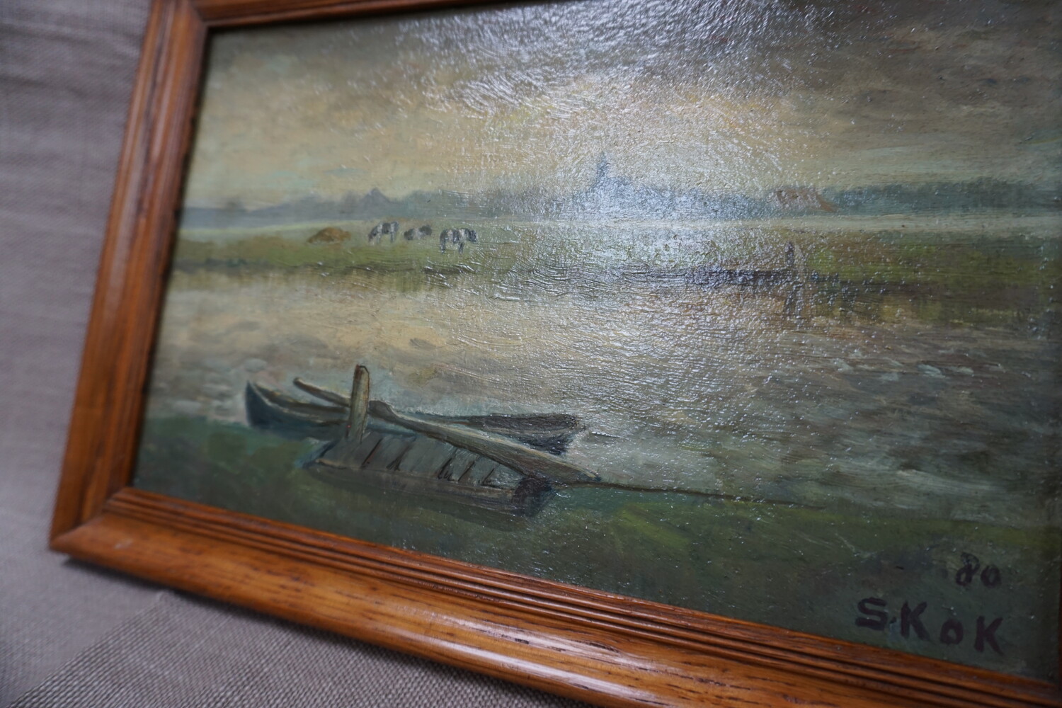 Lovely atmospheric Dutch landscape by S.Kok in 1980. Oil on panel with an oak frame.