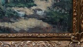 Early 20th century oil on canvas painting depicting a dappled farmhouse with blossoming trees and flowers and a couple of chickens, not the vacant clogs by the door of the house. Signed, but name is not clear.