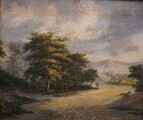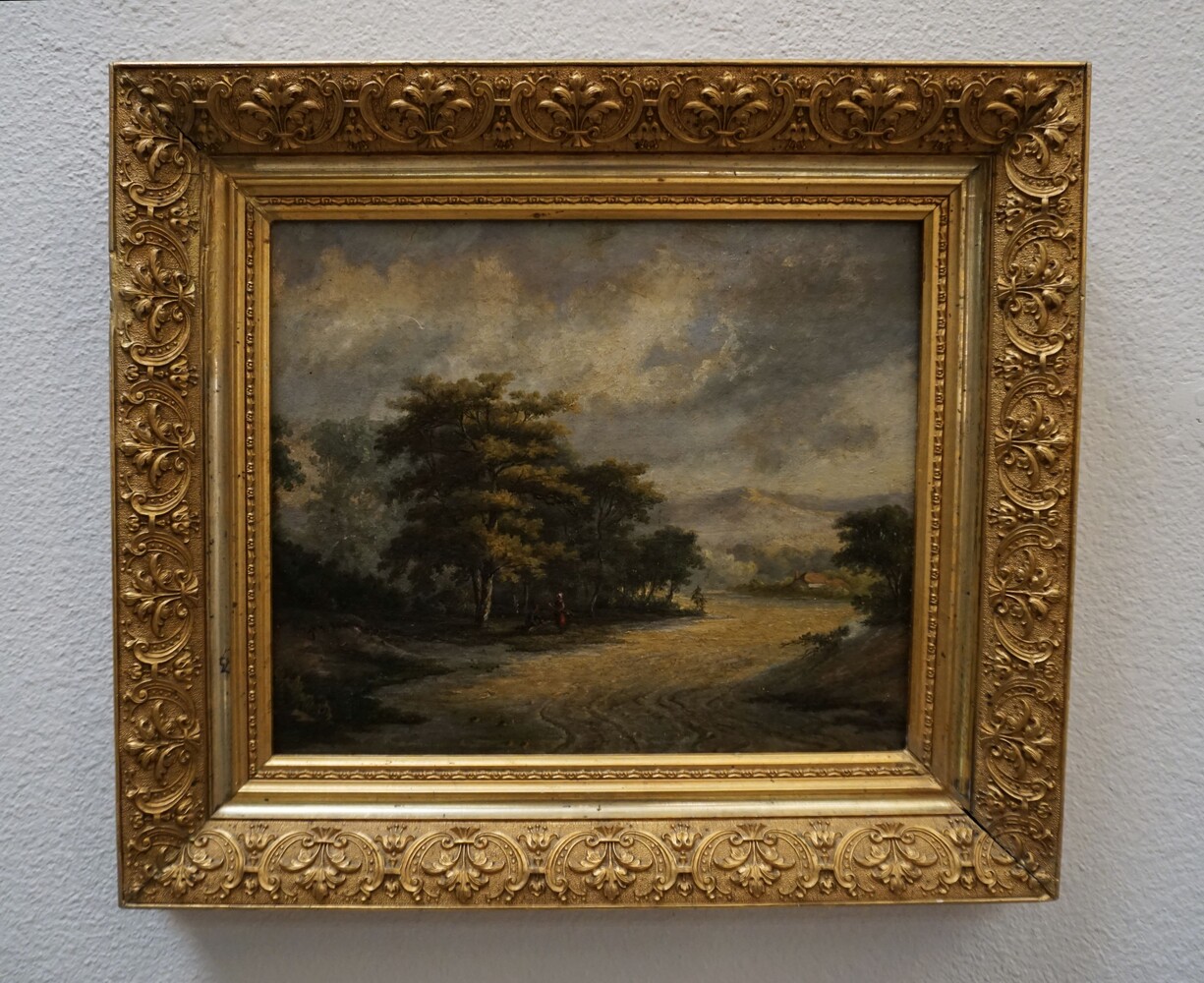 Lovely small work Romantic school, Europeaan, unsigned depicts people collecting firewood on the edge of a wood probably for the cottage in the distance. Oil on board early 20th century.