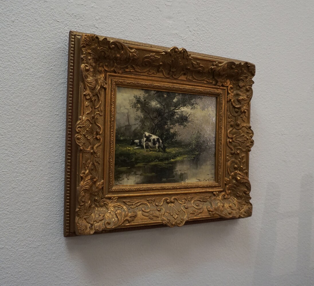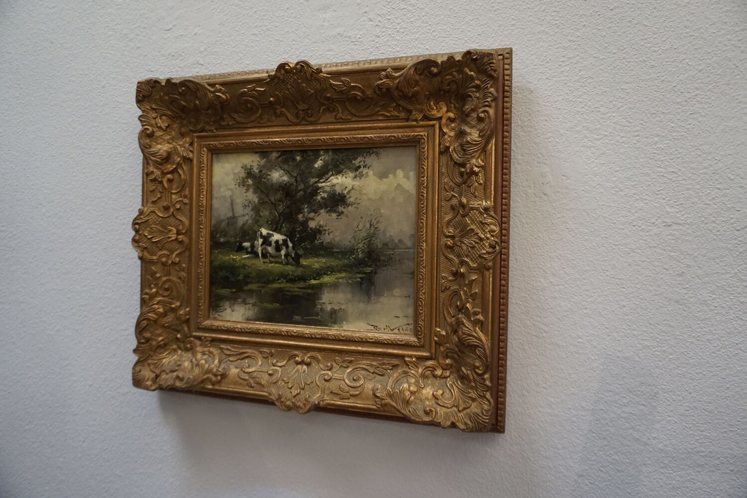 Oil on canvas cows grazing on the river bank, lovely atmospheric impressionist work signed V van de Velde.