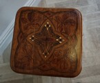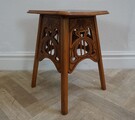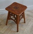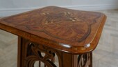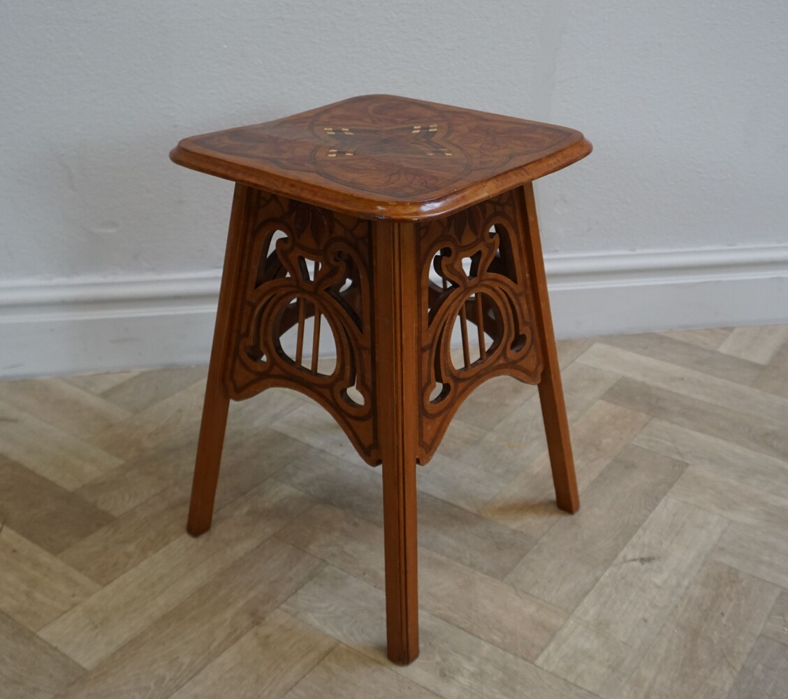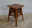 This is a delightful Art Nouveau table from the 1890s, stylish form with typical nouveau decoration curved design with cut out rails. It appears to have been inlaid, but this is burnt in poker lines and coloured stains on a light cedarwood frame. This piece has been completely restored and is in a strong condition.