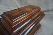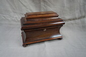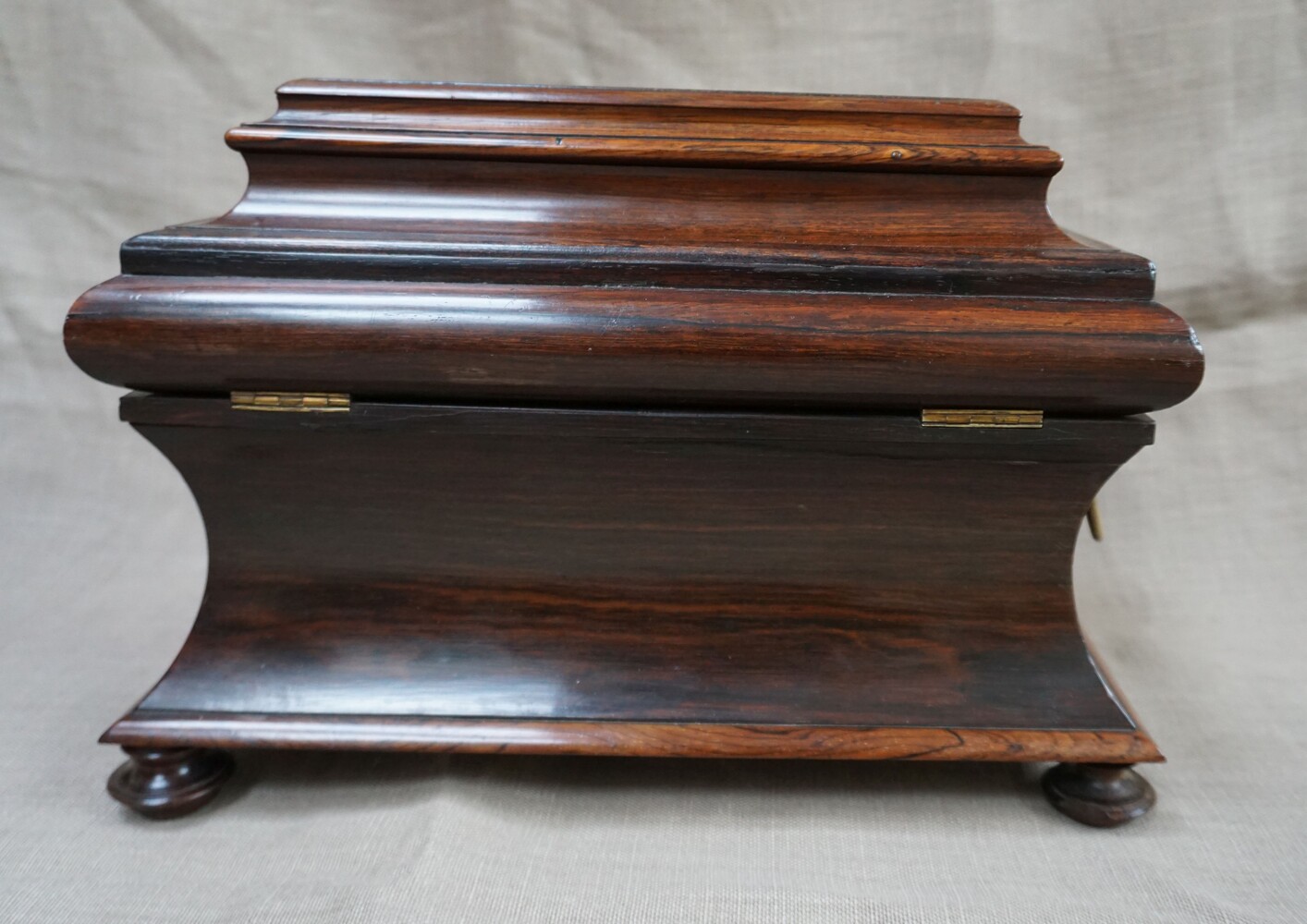 Lovely rosewood tea caddy from around 1820, elegant architectural design, two separate tea containers inside, one for Indian tea and one for Chinese tea, in the centre there would have been a glass tumbler used either for sugar or blending the two teas. In good restored condition, complete apart from the key and the glass tumbler.