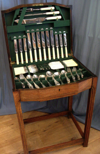 Here's is a lovely oak table canteen with Sheffield silver plated cutlery and bone handles by George Hides and sons made in the 30's, it has soup spoons fish knives and forks in addition to the normal items and is complete for six people, as well as many more extra items such as forks for ten and more spoons, the knives are in new state never used!!