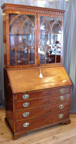 Lovely George III late 18th century bureau bookcase in mahogany, lovely origional pattina, good interior with fitted drawers with inlaid edges and ivory knobs, black tooled leather ledger.