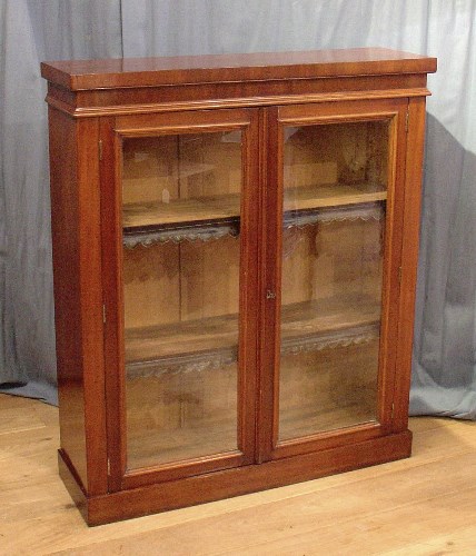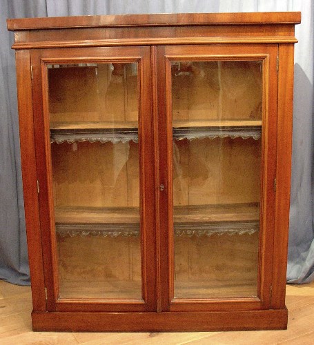 Here a lovely small mahogany  two door bookcase with two adjustable shelves, fully restored, nice leather dust flaps along the shelves.