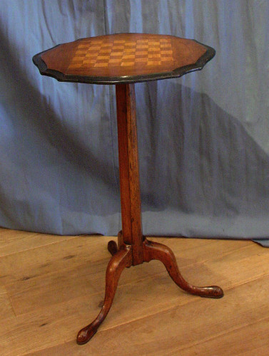 This is a charming 18th century table with a chess board inlaid top, loads of character, unusual straight shafted pedestal, not sure if it is origonal, never the less attractive piece.
