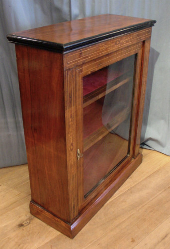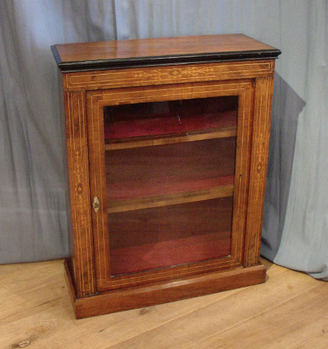 Here is a mid 19th century walnut pier cabinet, in good origonal finish waxed, lovely inlays, new red velvet interior, consistant with the origonal fabric.