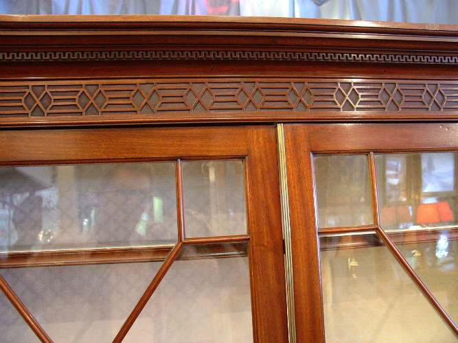Top moulding has dentills and Chinese chippendale fretted panels, I suspect this is an Edwards and Roberts piece as they were pretty much the only company that was producing to this quality in the early 20th century.