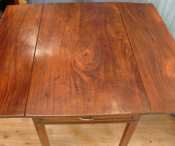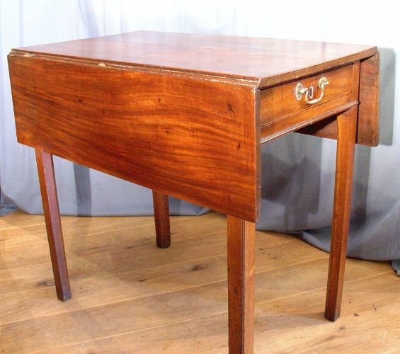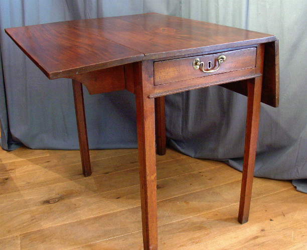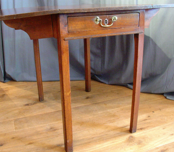 Here we have a nice solid mahogany pembroke table from around 1780, or a little earlier, lovely rich wax finished pattina, small drawer in one end, double brackets for supprting the flaps, lovely simple straight legs.