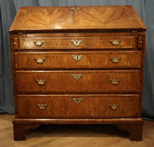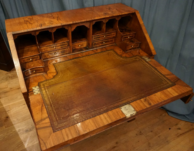 Lovely early 18th century Queen Anne bureau in figured walnut, crossbabanded with herringbone inlaid drawers and fall, oak lined drawers with new runners and lovely quadranted edges, with a good set of early handles.Interior is also very attractive with a lovely mellowed tooled hide desk and a good range of small drawers.The finish is very good being mainly a build up of wax pattina and the colour is very warm and consistant throughout.
