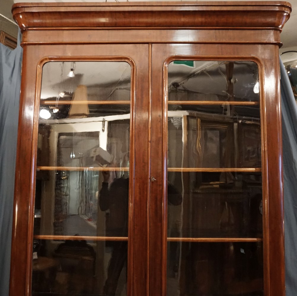 Lovely Victorian mahogany bookcase, just been completely restored, original French polish has been preserved and new polish has been applied after an extensive cleaning back ( 18 hrs work !), the effect is a lovely shiny bookcase with a good pattina, nice example, top carcase has adjustable shelves, dismantles into three parts.