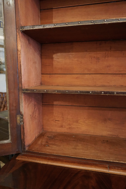 Lovely mahogany 19th century bookcase, lovely curl veneer doors and base top, completely restored, good sturdy construction, can be dismantled as it is all scerwed together.