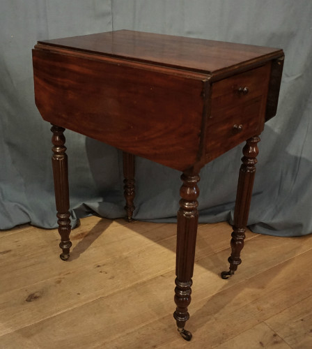 This is a mahogany dropleaf table commonly known as a work table, intended for the lady of the house to store her enbroidery and sewing projects in, in the rear there is a tin and marble lined cupboard, not sure exactly what that was for maybe a hot pan or iron? These are normally English but this one seems to be French in origin.