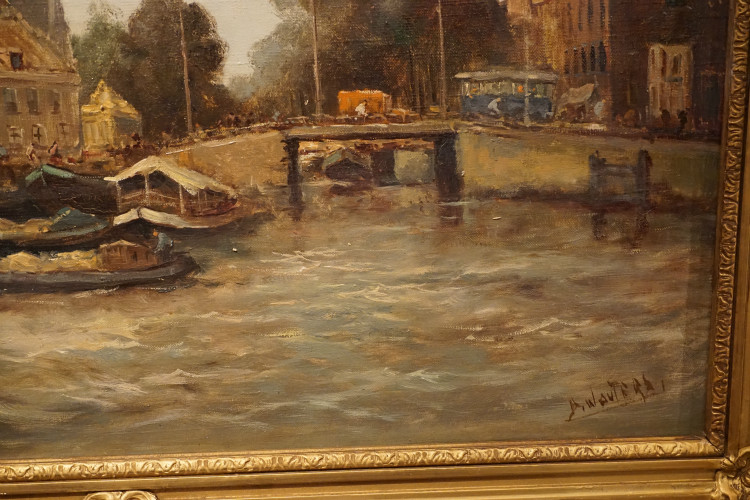 Here is a Impressionistic painting of the Singel in Amsterdam with the Koepel Church in the left side and the harbour control building with the mast on the top on the right, this dates the painting to pre war, probably the 20's, it is signed A Wouter, which is not a well known name never the less it is an accomplished atmospheric typical work from this time.