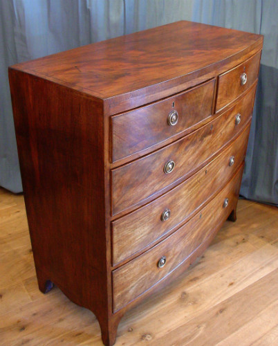 This is a late George III ( circa 1800) bow fronted chest of drawers in mahogany , very desirable model with the flush top and ebony string along the edge, nice pattined curl mahogany top with further ebony stringing, carcase is also decorated top and bottom with tulipwood banding .