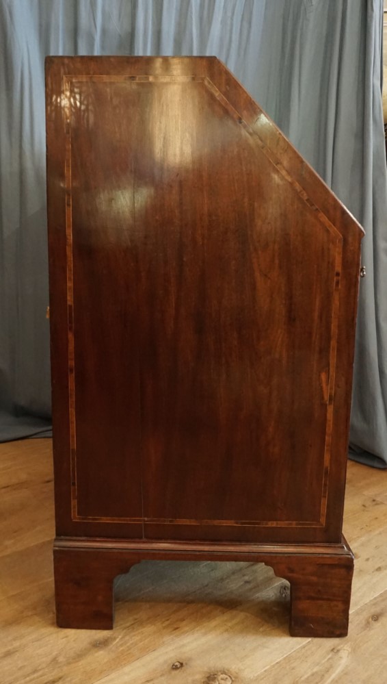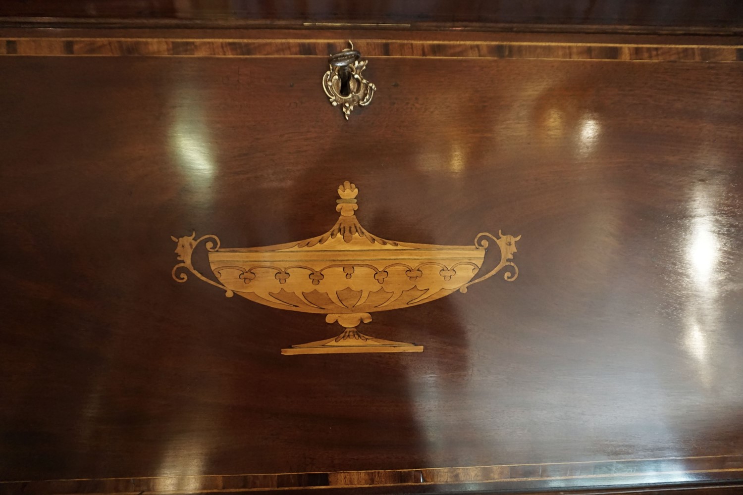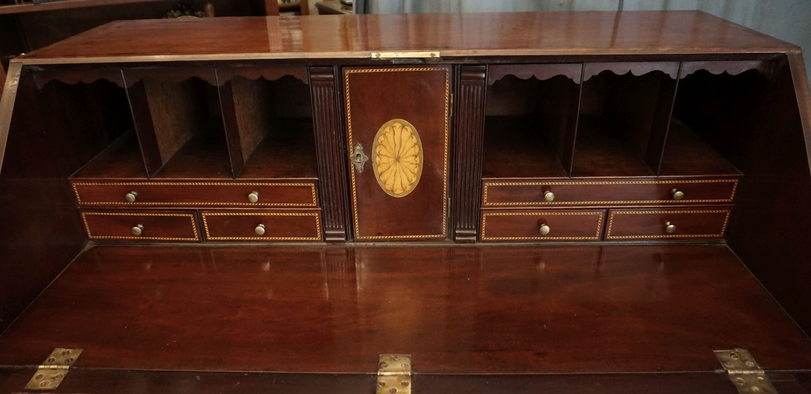 Lovely quality solid Cuban mahogany bureau 18th century, lovely inlays and a boxwood marquetry urn on the flap. Interior has a good number of drawers with pull out pillars, pigeon hole and secret compartment behind one of the drawers. This is a first class quality bureau and has had a full restoration including new drawer runners and re-polish work, represents a good example of these rare Cuban pieces.