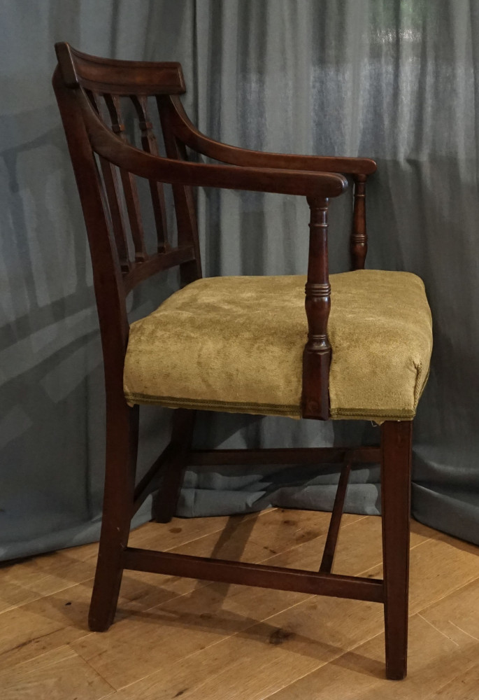 Here is a very handsome desk chair in mahogany from the early 1800's lovely shape with readed arms and the strengthening H frame underneath, has been newly re-covered, it was originaly part of a larger set but now singly makes a very useful desk chair.
