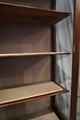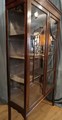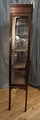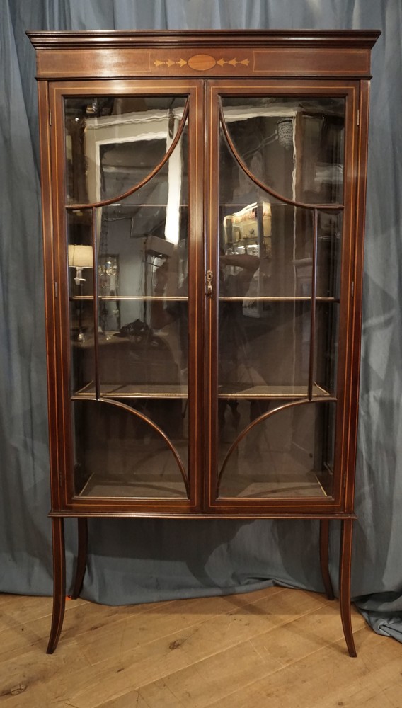 Stylish 1920 Sheraton revival display cabinet in mahogany with boxwood inlaid decoration, newly linned with a grey satin fabric interior.