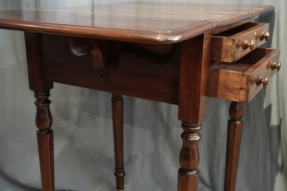 Here is a lovely small proportioned dropleaf table with two drawers, Cuban mahognay top with Honduras base, turned legs with brass cup castors, on the rear side two dummy drawers. Completely re-French polished and in first class state.