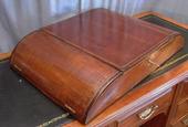 This is quite a unique writting box, beautifully made in inlaid mahogany it has rounded compartments that are both kept shut by the central flap, it has also two secret drawers, those of course will only be revealed to the purchaser, it has a number of adjustable compartmenst which are probably intended for a special purpose, there is also two keyhole plates on the bottom to lock this onto something, possibly it was part of an officers travelling furniture, and had a special place in a trunk of drawer.