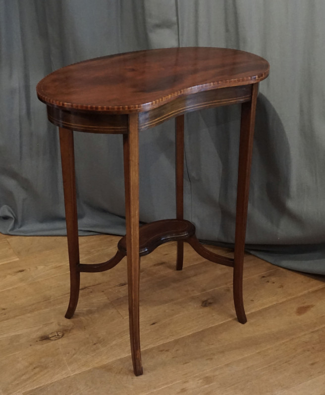 Lovely kidney form table from the early 1900's Sheraton revival with lovely dentil inlayed edging, all solid mahogany, stylish form and a useful piece.