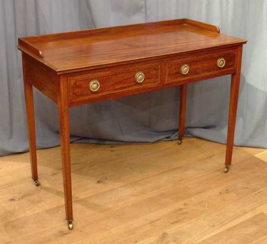 Solid mahogany writting table, inlaid drawers origional gilded handles, on castors.
