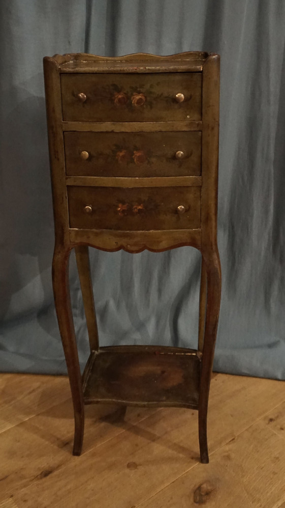 Small size bedside table in green with Chinese style landscapes painted on it.
