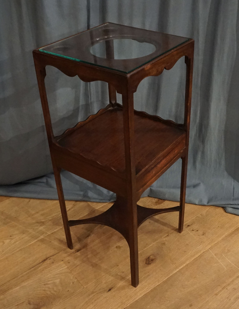 Here is an original 18th century Georgian washstand, with the holes for bekers and the washing bowl under a glass top.These were to be found in all the bedrooms in wealthy houses in England in the 18th and 19th century.