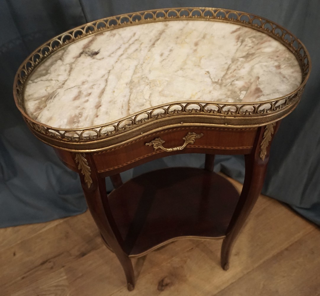 Inlaid marble topped French table vintage in lovely condition with a drawer.