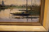 Lovely little oil on panel landscape probably Friesland, lake, mill farmhouse and man fishing in a boat, signed with a fries name but unknown. size 32cm x 24cm.