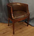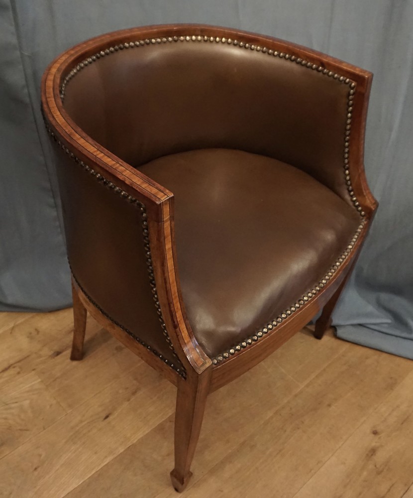 Tub chair from the 20's wooden frame with satinwood banding decoration, brown leather upholstery recently renewed.