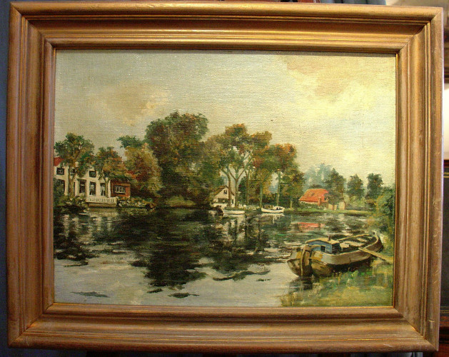 Nice little impressionist painting of the river Vecht at Loenen, paintied in the 20's by Co v/d Berg.