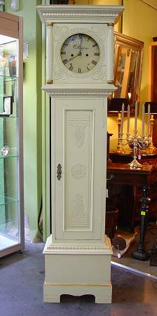 Longcase clock  1868 , probably Scandinavian nice colour , always been painted ,runs for therty days and strikes on the hour .183cm x 30cm x 50cm.