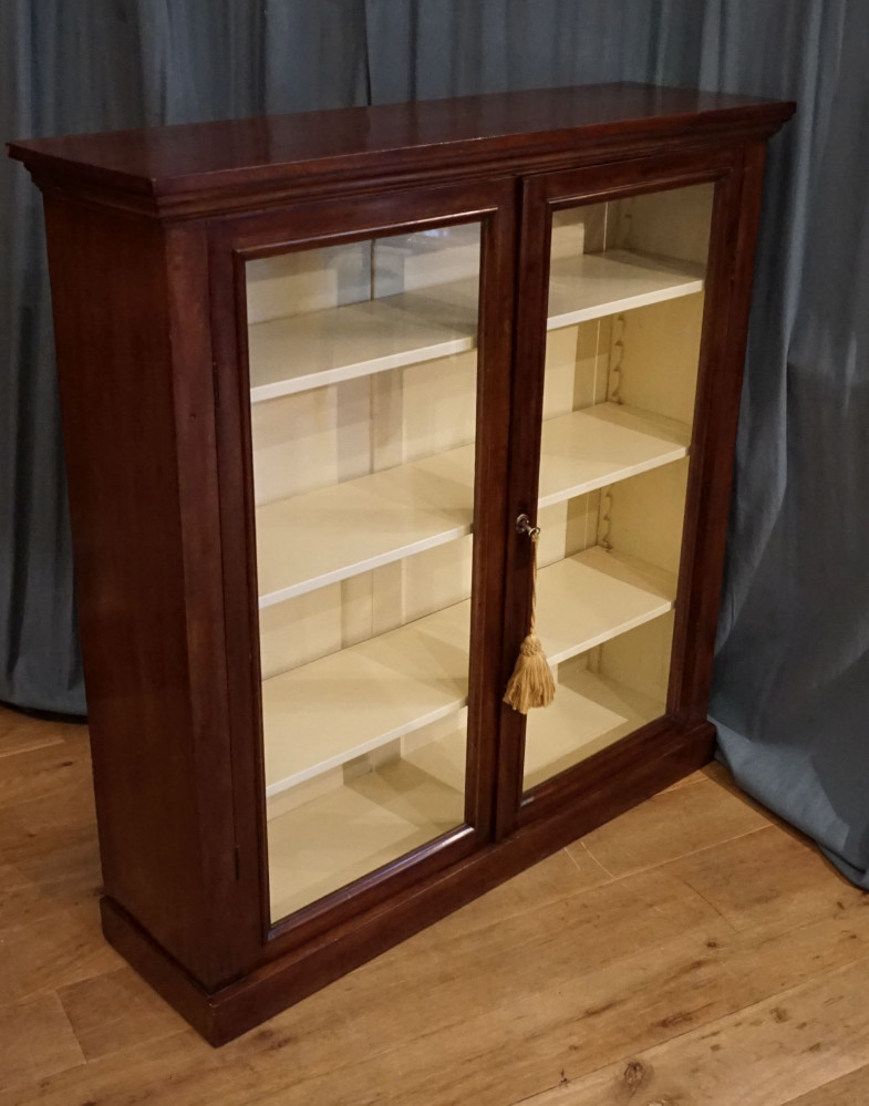 Here is an Edwardian bookcase in mahogany with two glass doors and three adjustable shelves, recently re-paintied interior in cream oil paint.