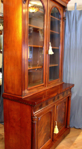 This is a stunning early 19th century bookcase, lovely quality, very solid, base has two lovely curl panels, and curl fronted drawer, inside a celleret drawer, which is very unuasual.